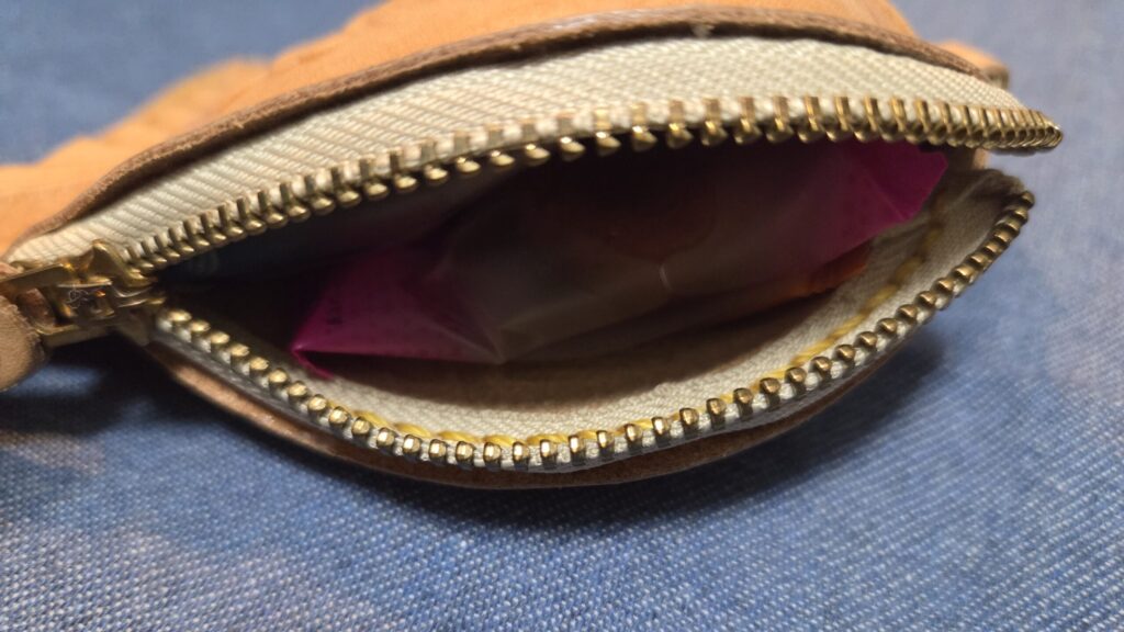 ファスナー付きですが、実用品というよりはアクセサリー感覚で持つ革小物という立ち位置です。